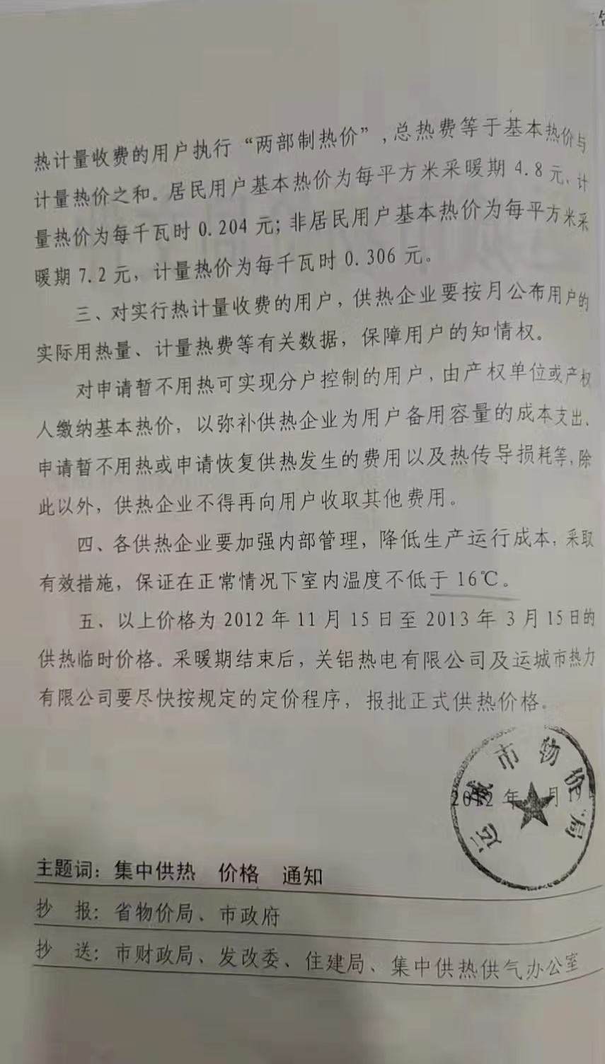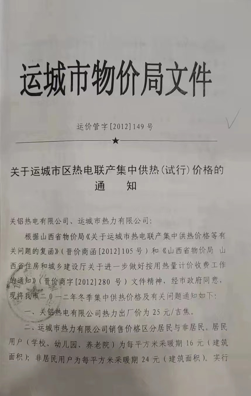 關于運城市城區(qū)熱電聯(lián)產(chǎn)集中供熱(試行)價格的通知